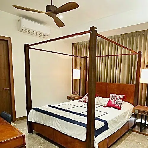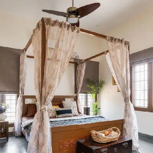 The guest room has a custom made wooden poster cot with carved panels on the head and footboard. This along with the rosewood console, trunk and carvings on the wardrobe accentuate a traditional theme in the bedroom