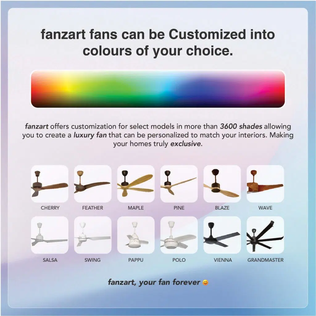 Pick your favourite from our curated selection of Top 5 Designer Fans we recommend that you can personalize from over 3600+ Colors 🎨. The fan blades can also be lacquer finished to match any color. In certain fans, the housing color can also be set to your personal favourite. Call us to know more.