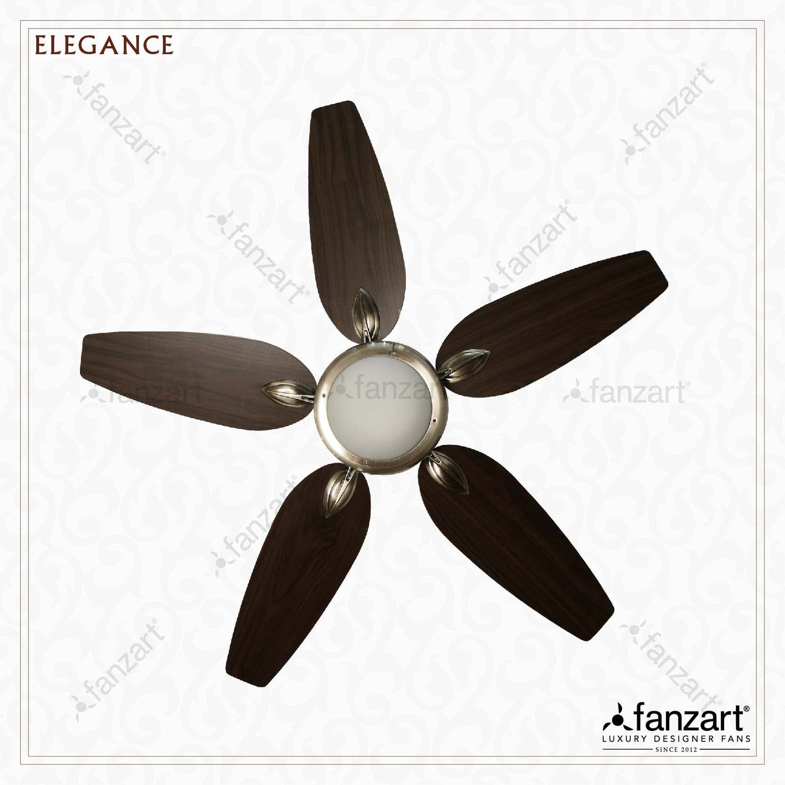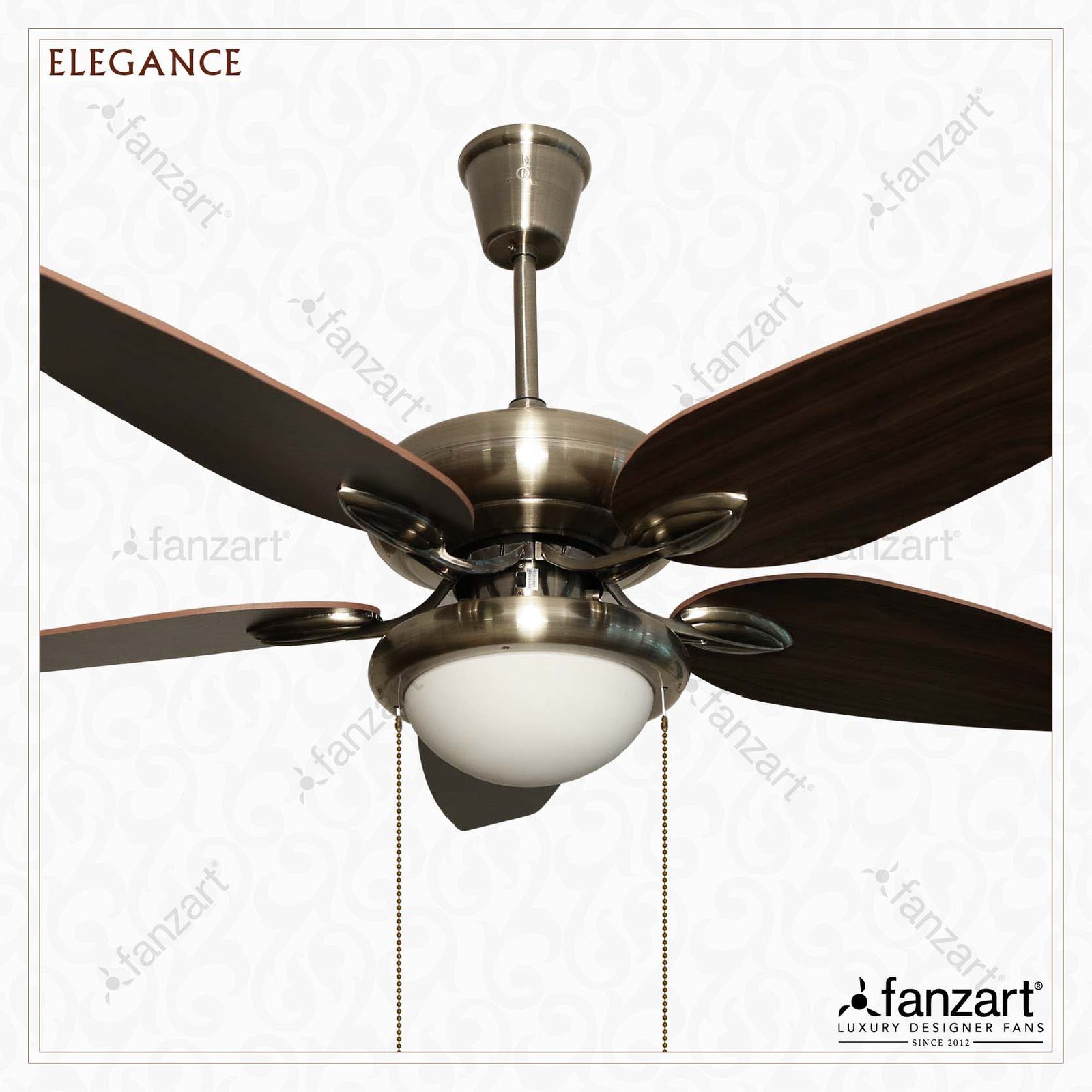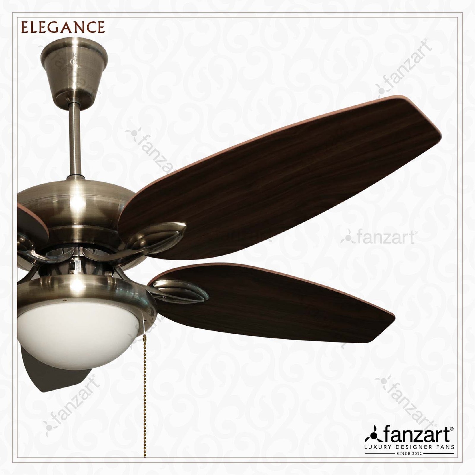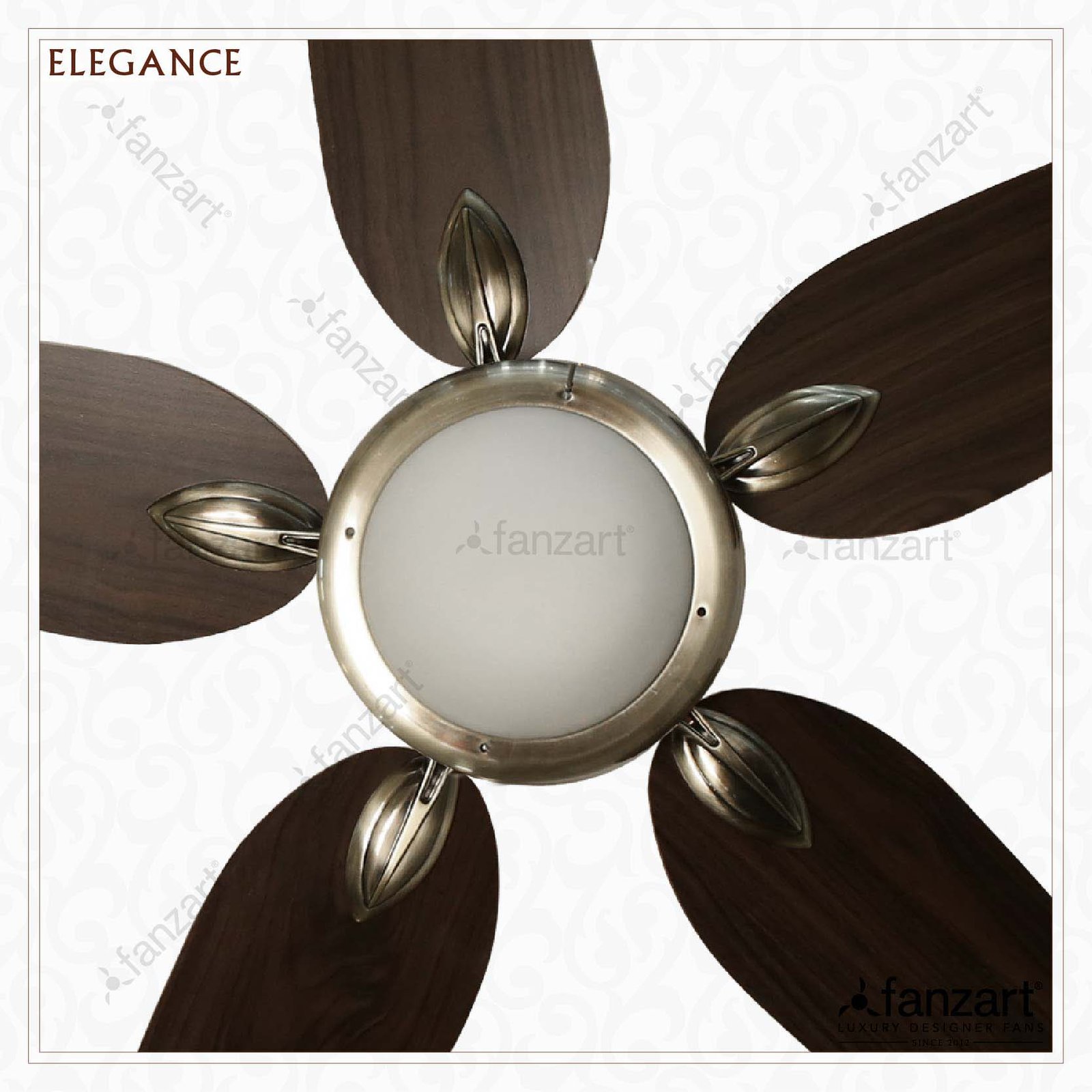 Find Elegance, a fancy designer ceiling fan from Fanzart. A stylish looking ceiling fan with antique brass color, 5 special wooden reversible dual color blades & multicolour LED light kit.