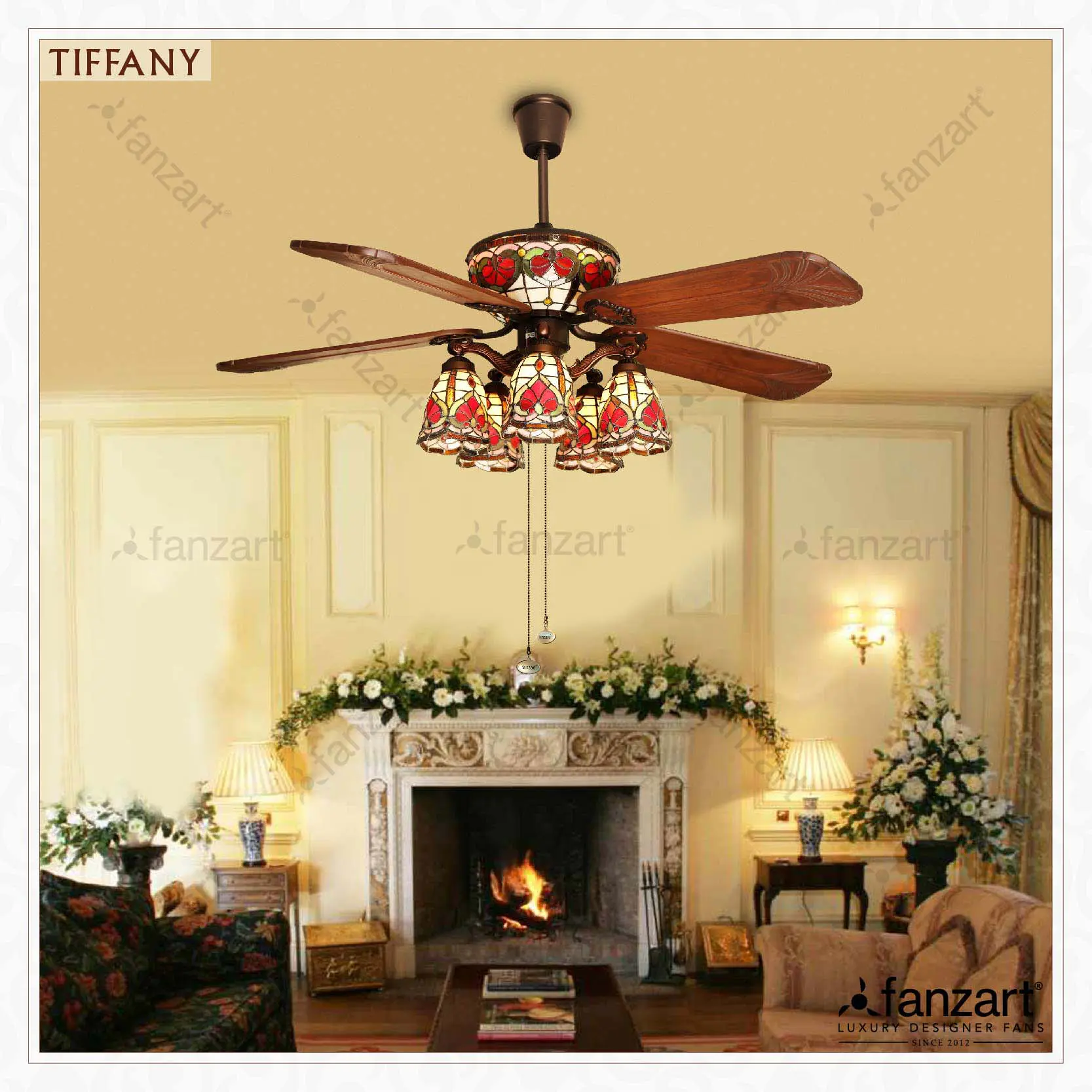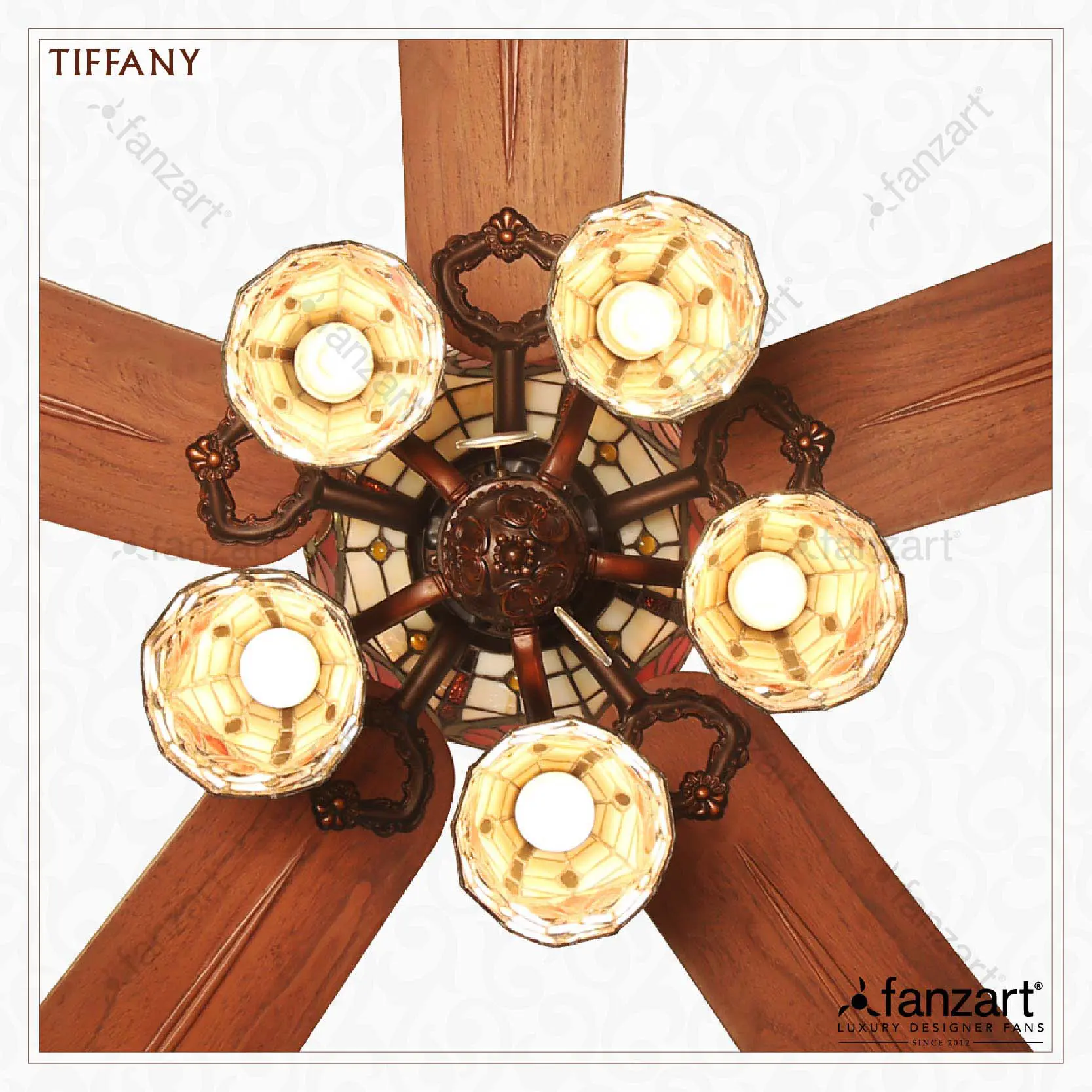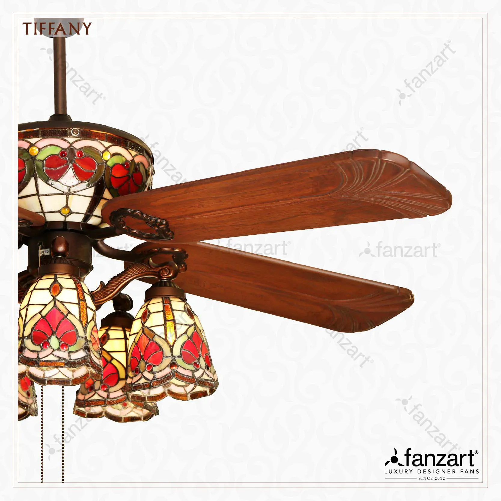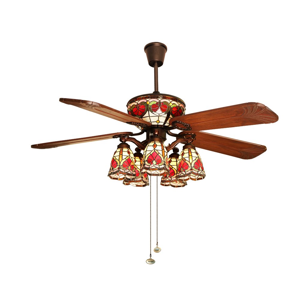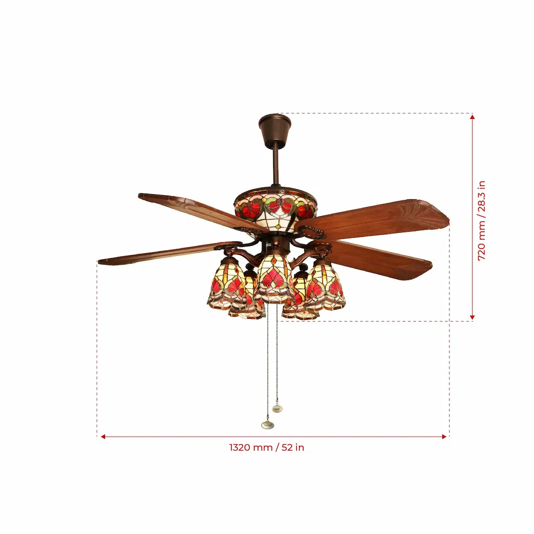 Tiffany is intricately designed with hand painted multi-colour stained glass and hand crafted natural wooden blades.